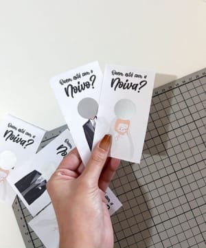 No pacote adicional da raspadinha, você ganha até 30 unidades de raspadinhas personalizadas com rostos de artistas e 1 delas com o rosto do noivo (ou da noiva).